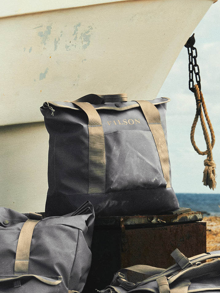 When skimming upstream in a river sled to reach prime steelhead runs, nothing protects gear from spray and waves like Filson waterproof tote made with our dry-bag construction. Filson waxed canvas totes made with Tin Cloth are a lighter-weight alternative to our Rugged Twill tote bags, providing increased water resistance and backed by a century-long legacy of unfailing protection.